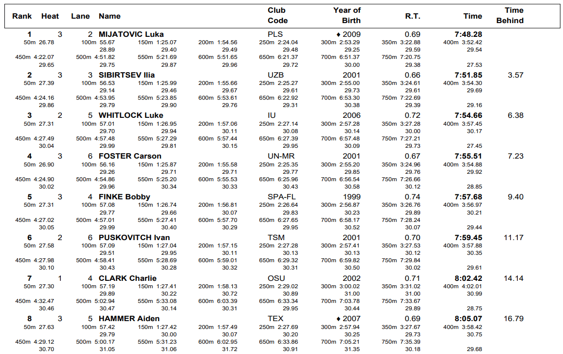 Uzbekistan’s Ilia Sibirtsev had the second-best time of the night in 7:51.85 while Indiana’s Luke Whitlock claimed third in 7:54.66. Whitlock, who posted his time out of the early heats, was the second-place finisher in the event at the 2024 Olympic Trials. Carson Foster, fresh off a dominant effort in the 400 IM Saturday, placed fourth (7:55.51) while Finke ended up fifth (7:57.68).