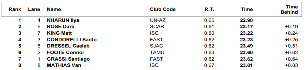 Dare Rose placed second in 23.17 while Matt King edged Santo Condorelli for third, 23.22 to 23.23. Caeleb Dressel, a two-time world champion in this race, fell to fifth in 23.49. His morning time of 23.19 would have been third here.