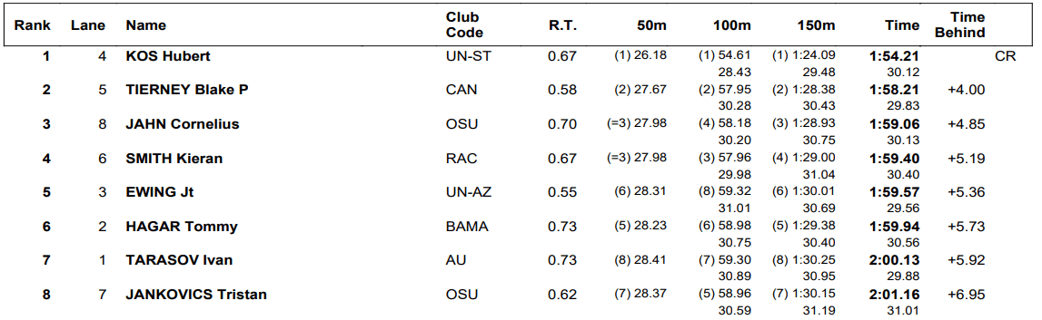 Canada’s Blake Tierney placed second here in 1:58.21, four seconds behind Kos, while Ohio State’s Cornelius Jahn came through for third in 1:59.06. The third-quickest time of the evening belonged to NC State’s Daniel Diehl, the winner of the B-final in 1:58.40.