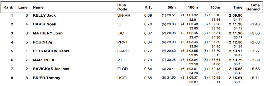 Kelly clocked 2:09.90, becoming the sixth-quickest U.S. swimmer this season. He finished almost one-and-a-half seconds ahead of the field as Indiana’s Noah Cakir placed second in 2:11.38. Hoosier-trained veteran Josh Matheny was third in 2:11.98, followed by World Championships finalist AJ Pouch in fourth (2:12.50).