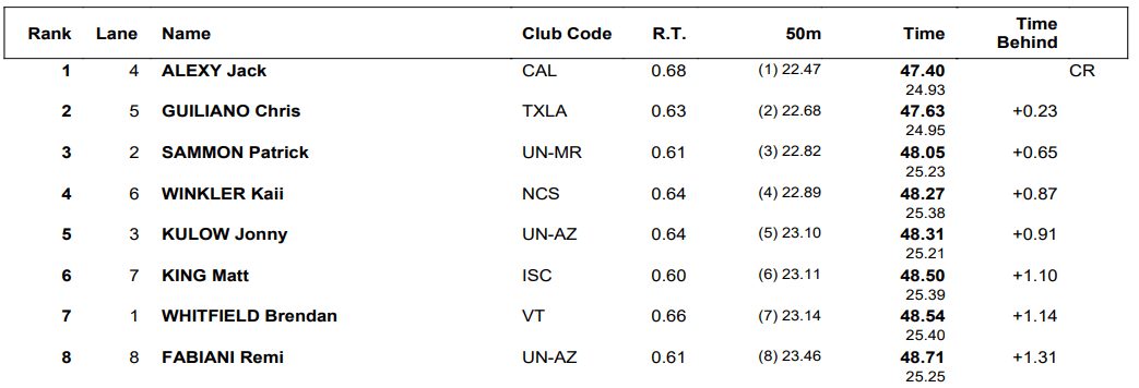 Alexy’s final time was 47.40, about six tenths behind the American record of 46.81 he set in the World Championships semifinals this summer. Guiliano came in second in 47.63 while Patrick Sammon, who joined Alexy in the Worlds final, placed third in 48.05. Kaii Winkler (48.27) and Jonny Kulow