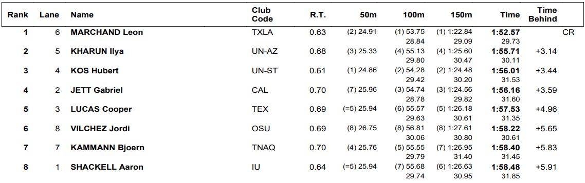 Marchand won the event in 1:52.57, becoming the second-fastest swimmer in the world for 2025 and beating Kharun’s 2023 meet record of 1:54.66. The Frenchman surpassed the 1:52.64 that Poland’s Krzysztof Chmielewski swam for silver in the event at the World Championships, with only Luca Urlando (1:51.87) quicker this year. Marchand’s best time of 1:51.21 ranks him as the second-fastest man in history.