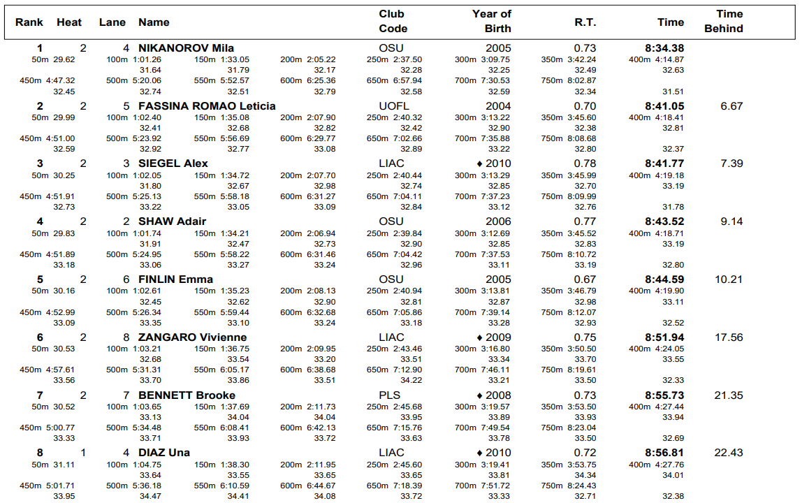 Ohio State’s Mila Nikanarov completed the distance double with a dominant effort in the women’s 800 free. Three days after her 1500-meter victory, Nikanarov never trailed in the 16-lap race on the way to a final time of 8:34.38. She was within seven seconds of the time she swam on the way to gold in the event at the World University Games this summer (8:27.61). Rounding out the top three behind Nikanarov were Louisville’s Leticia Fassina Romao (8:41.05) and Long Island’s Alex Siegel (8:41.77).