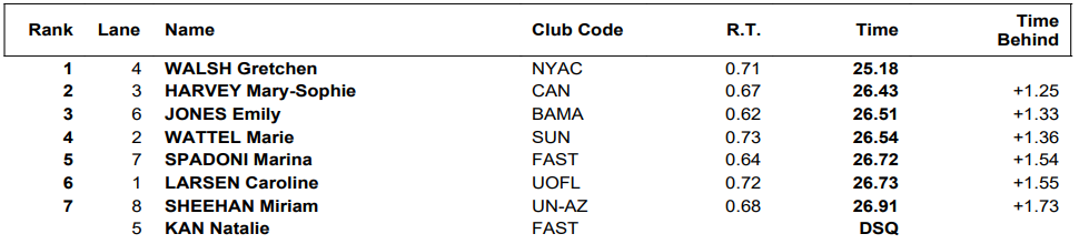 Versatile Canadian Mary-Sophie Harvey continued her run of top-three finishes with a time of 26.43 while Alabama’s Emily Jones claimed third (26.51).
