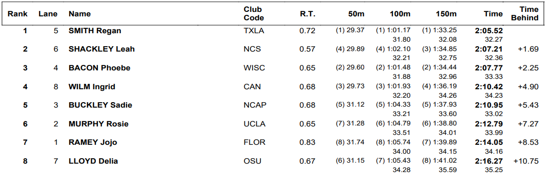 The top-three finishers came out well ahead of the field, with Shackley touching second in 2:07.21 and Bacon claiming third in 2:07.77. Shackley got under 2:07 and 2:06 for the first time this year, topping out at 2:05.99 at WUGs in July. No other swimmer went under 2:10.