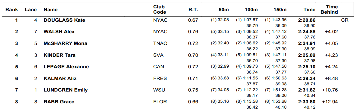 Douglass swam a time of 2:20.86, lowering the meet record of 2:21.87 she set back in 2023. The runnerup spot here went to Alex Walsh, a longtime teammate of Douglass at UVA. Walsh finished in 37.76 to surpass a fading McSharry at the finish by three hundredths, 2:24.88 to 2:24.91, with Tara Kinder (2:25.09) and Alexanne LePage (2:25.10) just outside the mix.