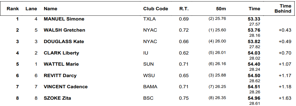 Manuel scored the win in 53.33, one-third of a second ahead of Walsh’s 53.76. Douglass placed third in 53.82. Both Walsh and Douglass had already picked up victories earlier in the session. In fourth was Indiana’s Liberty Clark, her time of 54.03 a best time by almost four tenths.