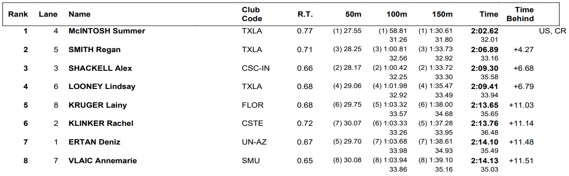 McIntosh broke the U.S. Open record of 2:03.87 set by Regan Smith in 2023 while demolishing Smith’s previous meet record of 2:06.72 from the same year. Smith was in this race as well, pulling a double after winning the 200 back earlier in the session, and she came in second at 2:06.89. Alex Shackell, who swam in second place for most of the race before fading down the stretch, came in third at 2:09.30, narrowly holding off Lindsay Looney (2:09.41).