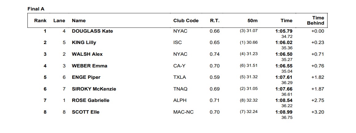 King was just behind at 1:06.02 to hold off Walsh (1:06.50) and Weber (1:06.55) as Virginia past and present went 1-2-4.