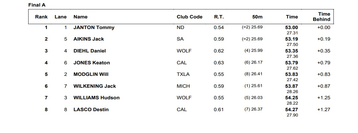 Aikins finished second in 53.19, holding off Daniel Diehl (53.35) and Jones (53.79). Will Modglin finished fifth in 53.83.