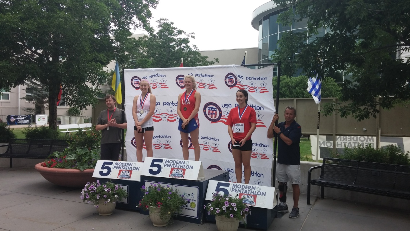 Before the last event (combined running/shooting), Margaux Isaksen had a solid lead against her sister Isabella, while National Team member Samantha Achterberg (Littleton, CO) was in 3rd place. Samantha won combined event, which secured her the 2nd place at National Championships Senior division. Margaux isaksen won gold, and Isabella Isaksen finished in 3rd place. Final results of three medalists:
