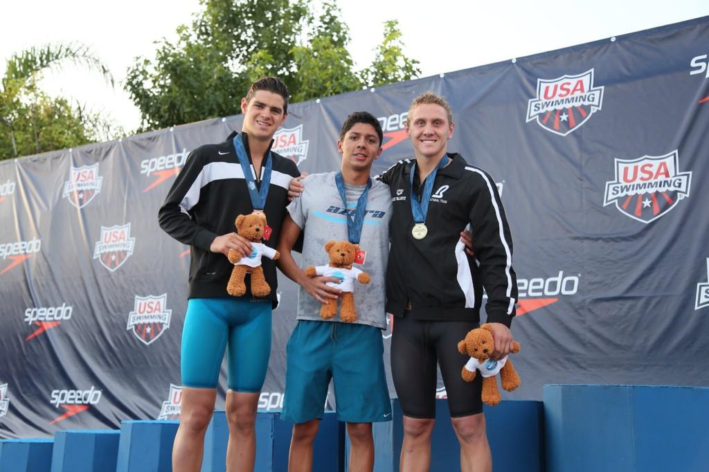 Buenaventura’s Alex Valente had a powerful swim this evening as he won in 53.09. That clipped the 53.10 he clocked this morning that stands as his personal best. He has now dropped a second from last year as his best effort a year ago was a 54.20 at these junior national championships. Azura’s Luis Martinez snared silver with a time of 53.34 while 15-year-old pro Michael Andrew posted a best time of 53.46. That not only beat the 53.90 he posted this morning but moved him to sixth all time in the 15-16 age division. He has a ways to go to catch up to Justin Lynch’s 52.75 national age group record from 2013.