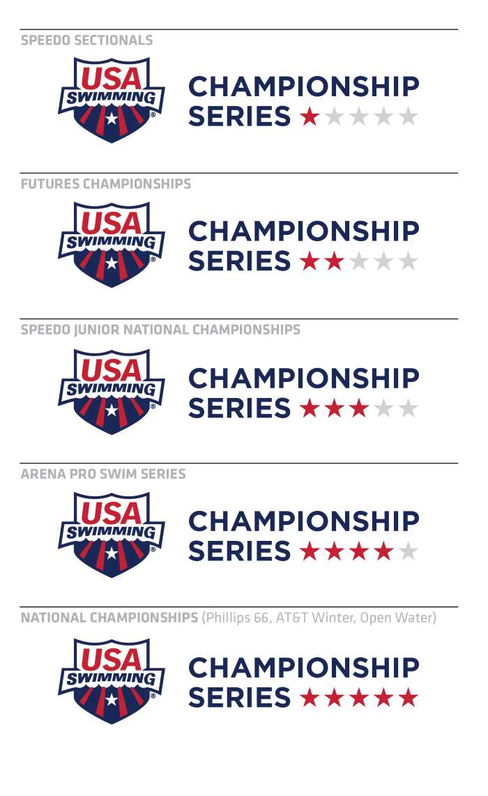 Most notable in the marks is a visual five-star hierarchy connecting USA Swimming events into a “Championship Series,” ranging from Speedo Sectionals to the Phillips 66 National Championships, AT&T Winter National Championships and Open Water National Championships. This progression indicates the level of competition for each event and instills goal-setting for athletes to reach the next stage.