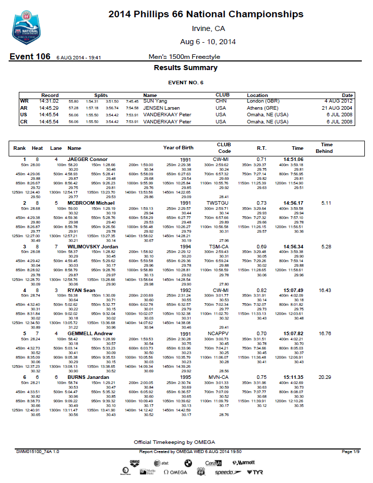 After initially having Michael McBroom on his hip through about 900 meters, Club Wolverine’s Connor Jaeger started pulling ahead and he wound up winning by more than five seconds with a 14:51.06. That performance jumped him to fifth in the world behind only Ryan Cochrane (14:44.03), Gregorio Paltrinieri (14:44.50) and Mack Horton (14:48.76). Jaeger will now be able to look forward as part of the Pan Pacifics Championship roster.