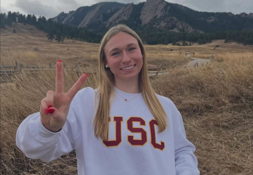 “After careful consideration I am excited to announce my verbal commitment to continue my academic and athletic career at the University of Southern California! Thank you to all my family, friends, coaches Wolfgang, Tricia, Jackson and my uncle Andy for helping me get here. A big thank you to Coach Meghan, Coach Lea, and the entire coaching staff at USC for giving me such an amazing opportunity. I can’t wait to become a Trojan! FIGHT ON! ✌️❤️💛”