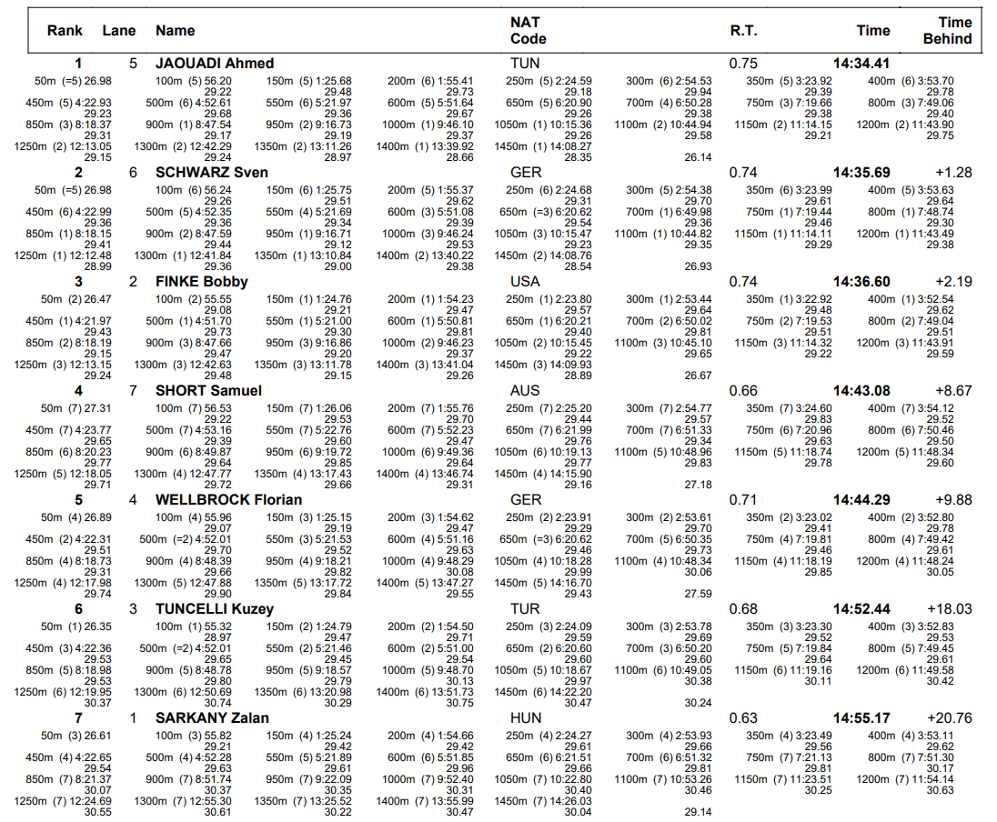 Jaouadi did not hold the lead for most of the race, but no one in the field could counter his closing speed, as was the case earlier in the week in the 800 free. Jaouadi becomes the sixth swimmer to sweep the distance events at the World Championships since the 800 free was added to the slate in 2001.