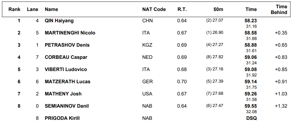 Neutral athlete Kirill Prigoda had posted the then-fastest time in the world in prelims at 58.53, seeking to return to the podium after many years away from international competition, but he failed to replicate that swim in future rounds. In the final, he was disqualified after initially finishing fourth.