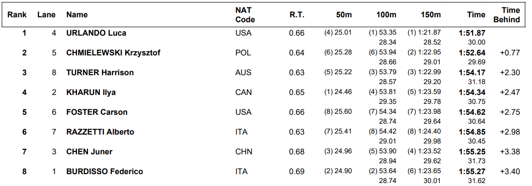 Entering the meet, only two swimmers in the field had ever been under 1:53: Urlando, with his stunning 1:52.37 from April that jumped him to fourth all-time in the event behind Milak, Marchand and Michael Phelps; and Kharun, who clocked 1:52.80 on the way to Olympic bronze last year. Chmielewski joined that club in prelims while Urlando reached that territory for the second and third times in his career in the first two rounds, setting himself up as a slight favorite for the final.