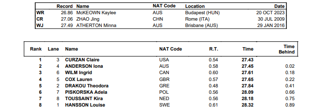 The 19-year-old stopped the clock in 27.43 to claim her third gold and fourth medal of the meet, 0.02 ahead of Australia’s Iona Anderson (27.45) and Ingrid Wilm of Canada (27.61) as the trio replicated the 100 back podium.