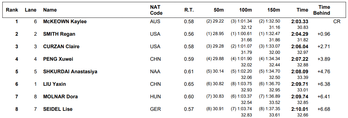 This marks the seventh occasion that McKeown has gone below 2:04 and her fastest ever recorded outside of her home country. The world record did not look to be in play until she exploded for a 30.83 final length. She came close to putting together an even-split race, with a time of 1:01.34 on the opening 100 meters and 1:01.99 coming back.