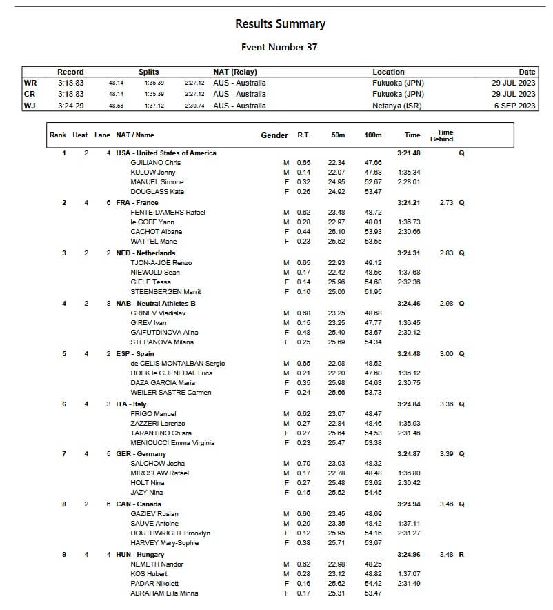 The U.S. was in Heat 2, which included the Netherlands (third in 3:24.31, with Marrit Steenbergen going 51.95 on the end) and Neutral Athletes B (fourth in 3:24.46, with a second-leg 47.77 from Ivan Girev). Canada also made it back in eighth from Heat 2. The Americans went 3:21 followed by eight teams in the 3:24s and 11 teams clustered within 1.03 seconds of the time of second-place France.