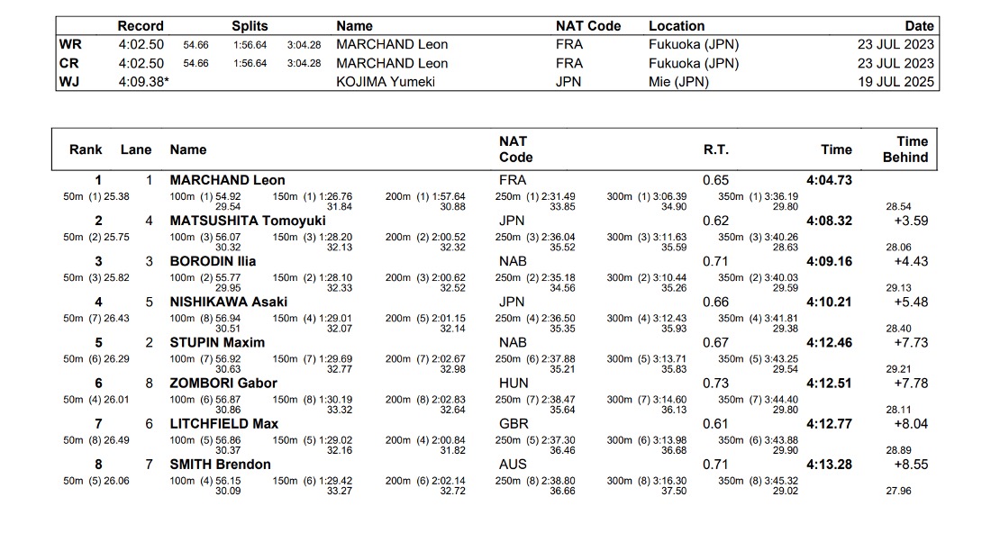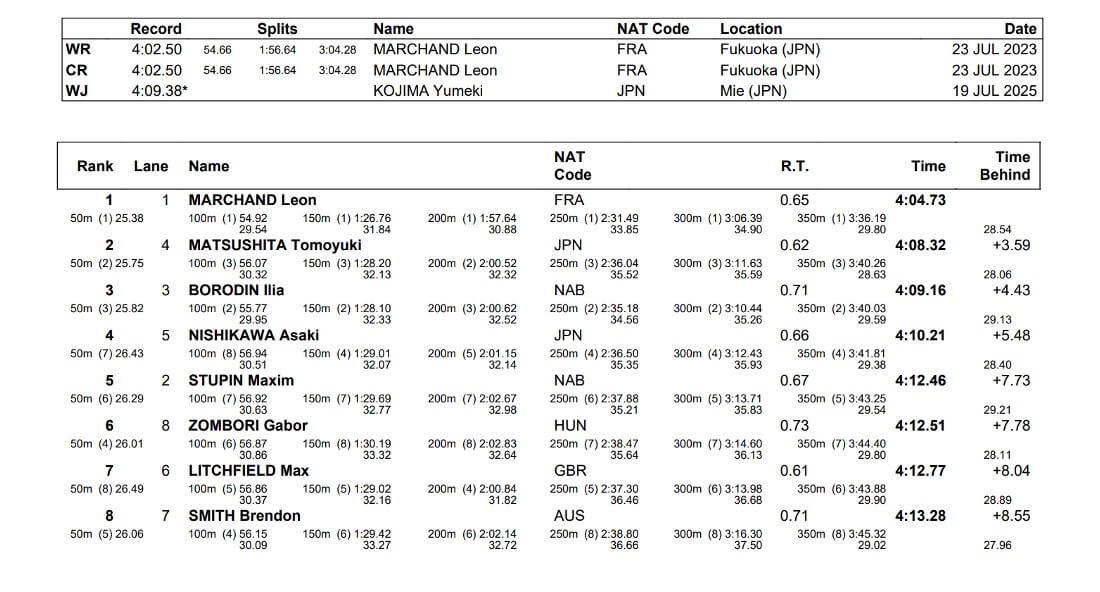 On the final day of competition, Marchand destroyed the field in the 400 individual medley, packaging a performance of 4:04.73 to record the fifth-fastest effort of all-time. Marchand finished comfortably ahead of Japan’s Tomoyuki Matsushita, who backed up his Olympic silver medal with another runnerup outing, going 4:08.32. The bronze medal went to Russian Ilia Borodin in 4:09.16.