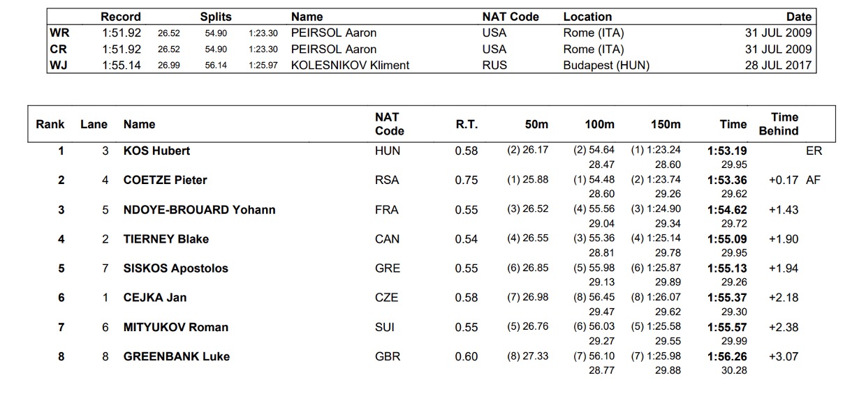World Championships, Day Six Finals: Hubert Kos Blasts European Record for Gold in 200 Backstroke; African Record for Pieter Coetze