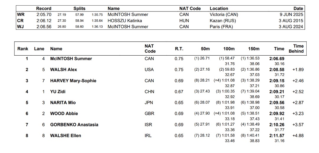 Leading fron start to finish, McIntosh capped the second night of action at the World Championships in Singapore with a gold medal in the 200 individual medley. McIntosh touched the wall in 2:06.69, which was nearly a second off her world record of 2:05.70. Nonetheless, the 18-year-old accomplished her goal – win.