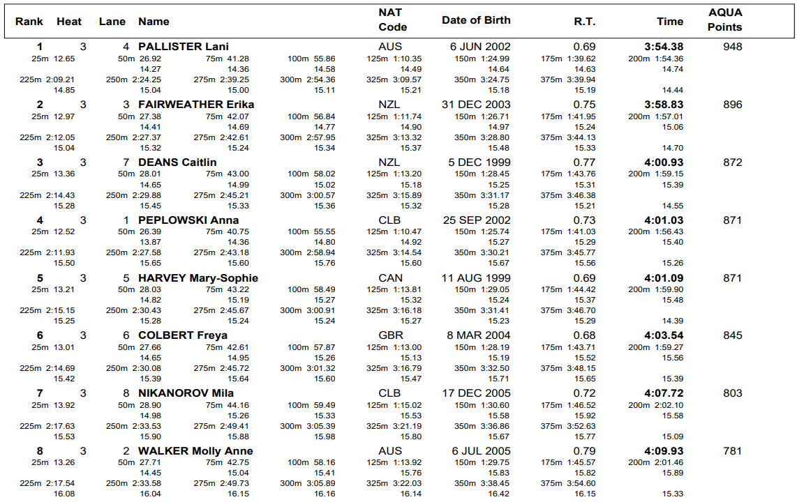 Pallister finished in 3:54.38, two-thirds of a second behind her best time of 3:53.73 that ranks No. 3 all-time. Taking second was New Zealand’s Erika Fairweather, the 2024 world champion in the event, who pulled clear of everyone else to take silver in 3:58.83. Third went to fellow Kiwi Caitlin Deans in 4:00.93, just ahead of Peplowski (4:01.03) and American Mary-Sophie Harvey (4:01.03).
