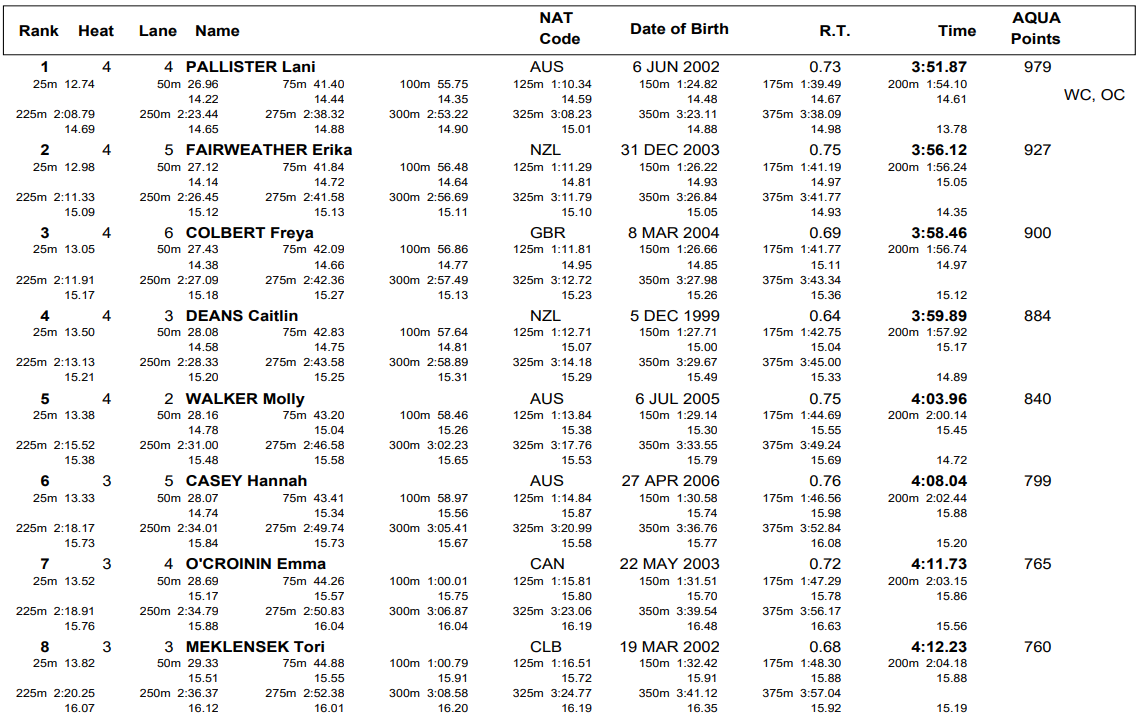 Fairweather placed second here in 3:56.12 while Great Britain’s Freya Colbert was third in 3:58.46. The second swimmer from New Zealand, Caitlin Deans, was the only other swimmer to finish under 4:00 (3:59.89).