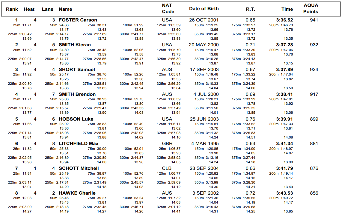 Foster checked in at 3:36.52, his fastest time during the three-meet circuit by more than a second. “It’s been great,” Foster said. “The plan was going to the first stop, use it as the training meet. I was telling my wife, first time, probably two and a half years where I’ve really had fun for me. last three weeks, so it’s an answered prayer to be able to come here and swim well, and more importantly, have fun. So I just want to take advantage of that. “