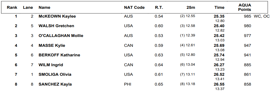 McKeown was in second place at the halfway point, 0.16 behind O’Callaghan, and Walsh pushed ahead with her usual stellar underwater work. But the 200-meter specialist came through in the closing strokes to steal the win in 25.35, five hundredths ahead of Walsh (25.40) while O’Callaghan was a further two hundredths adrift (25.42). McKeown clipped her own World Cup and Australian records by a hundredth, and she remains the third-fastest swimmer in history behind Regan Smith and Maggie Mac Neil.