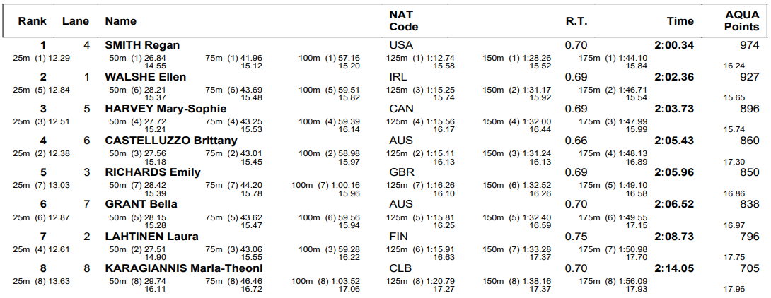 Ireland’s Ellen Walshe was in fifth place at the halfway point, but an electric back half helped her pull ahead of everyone in the field aside from Smith, and she even closed the gap on the American down the stretch. Walshe touched in 2:02.36 while Canadian Mary-Sophie Harvey placed third in 2:03.73.