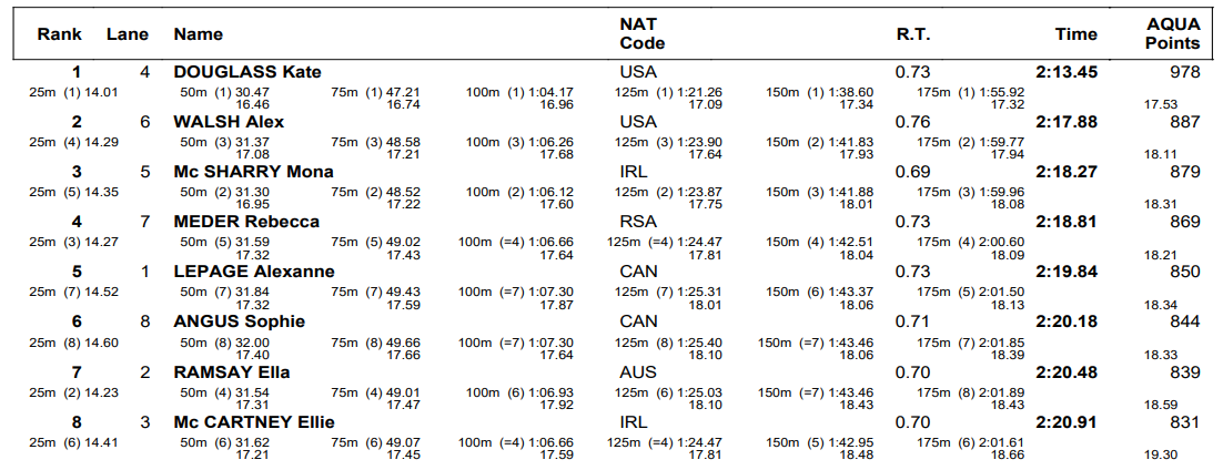 For the second consecutive meet, Douglass’ University of Virginia training partner Alex Walsh came in second place here, finishing well to touch in 2:17.88. Ireland’s Mona McSharry came in third at 2:18.27, with South Africa’s Rebecca Meder closing well to place fourth (2:18.81).