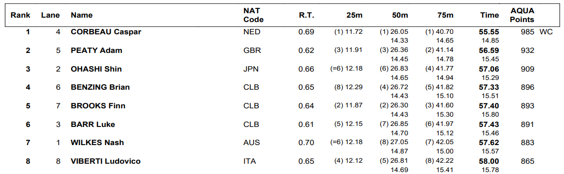 Corbeau blasted a mark of 55.55, clipping the series record of 55.61 that had stood since 2009. Cameron van der Burgh first posted that mark in a polyurethane-suit-aided performance that was then the world record, and Qin Haiyang tied the time last year. Corbeau became the fifth-fastest performer in history, trailing Shymanovich, Adam Peaty, Qin and Kirill Prigoda.