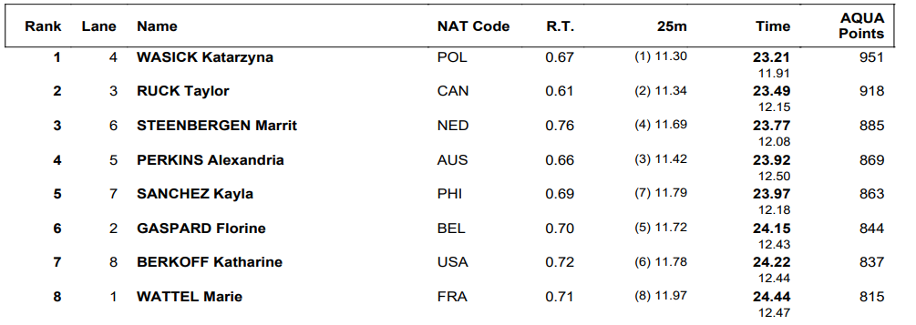 Canada picked up a top-three finish here, the first of the evening for the women of the home country, as Taylor Ruck touched in 23.49 for second place. Dutch swimmer Marrit Steenbergen, the world champion in the 100 free, was third in 23.77.