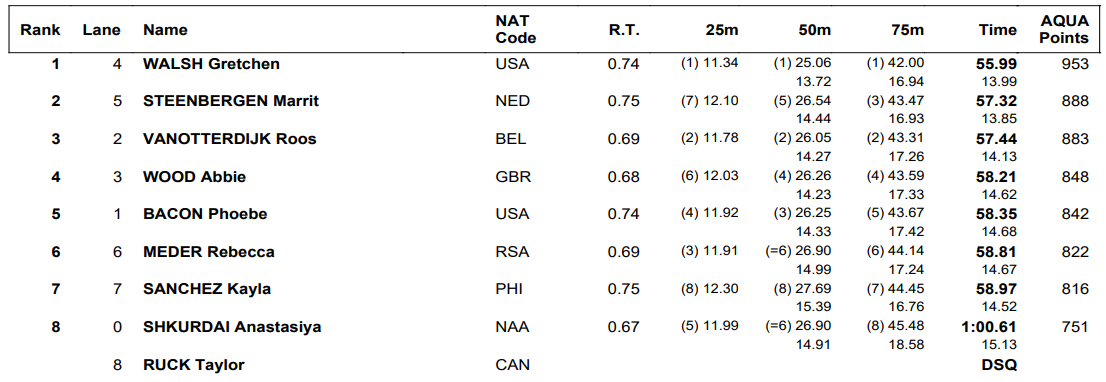 The Netherlands’ Marrit Steenbergen, moments removed from finishing third in the 50 free, came in second in 57.32. Steenbergen was in fifth place at the halfway point but closed well, even out-splitting Walsh on breaststroke and freestyle. Roos Vanotterdijk came in third at 57.44.