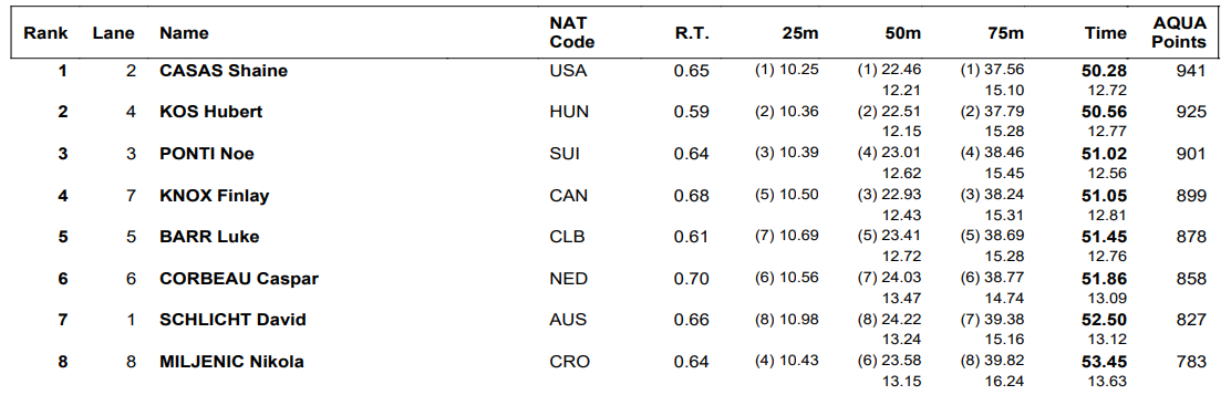 Kos took second here in 50.56 while Switzerland’s Noè Ponti, the world champion in the event, took third in 51.02 ahead of Canadian Finlay Knox (51.05). Caspar Corbeau, the 100 breast winner, was sixth (51.86).