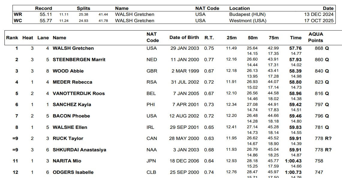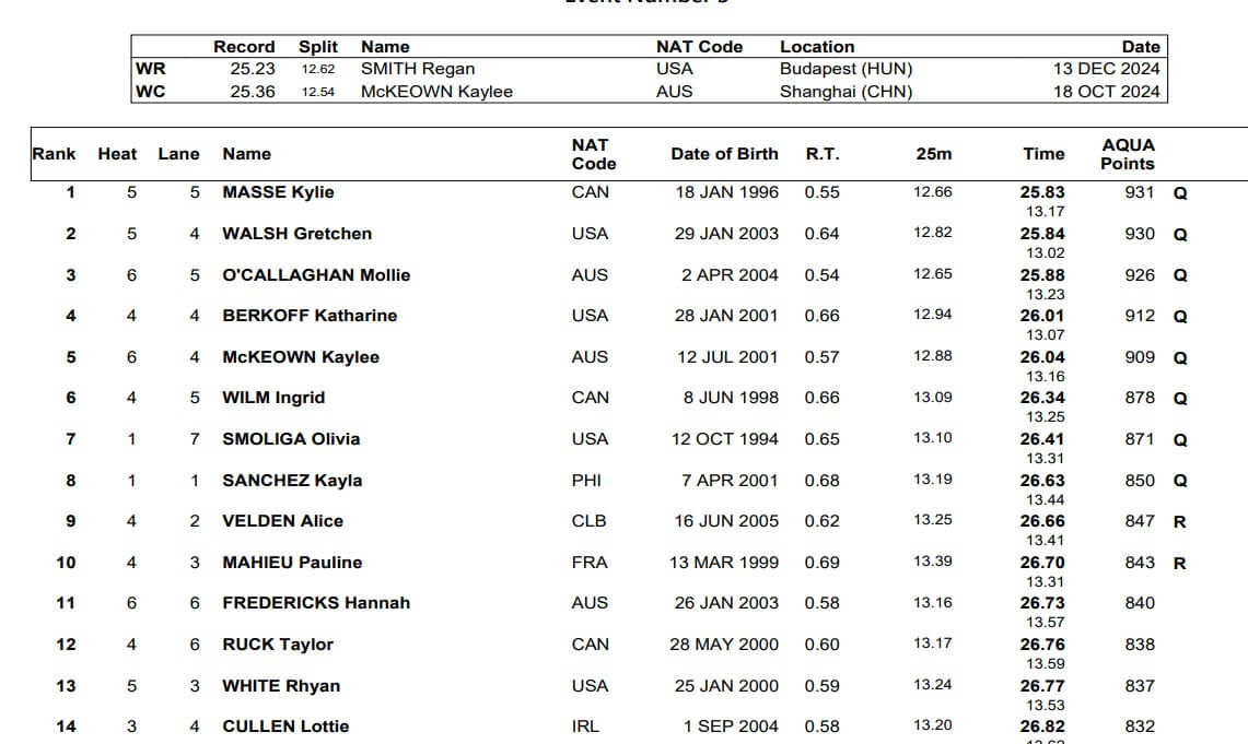 USA’s Gretchen Walsh grabbed the second seed with a swim of 25.84, followed by Australia’s Mollie O’Callaghan (25.88), USA’s Katharine Berkoff (26.01) and Australia’s Kaylee McKeown (26.04), making an already fast 50 race even closer heading into finals.