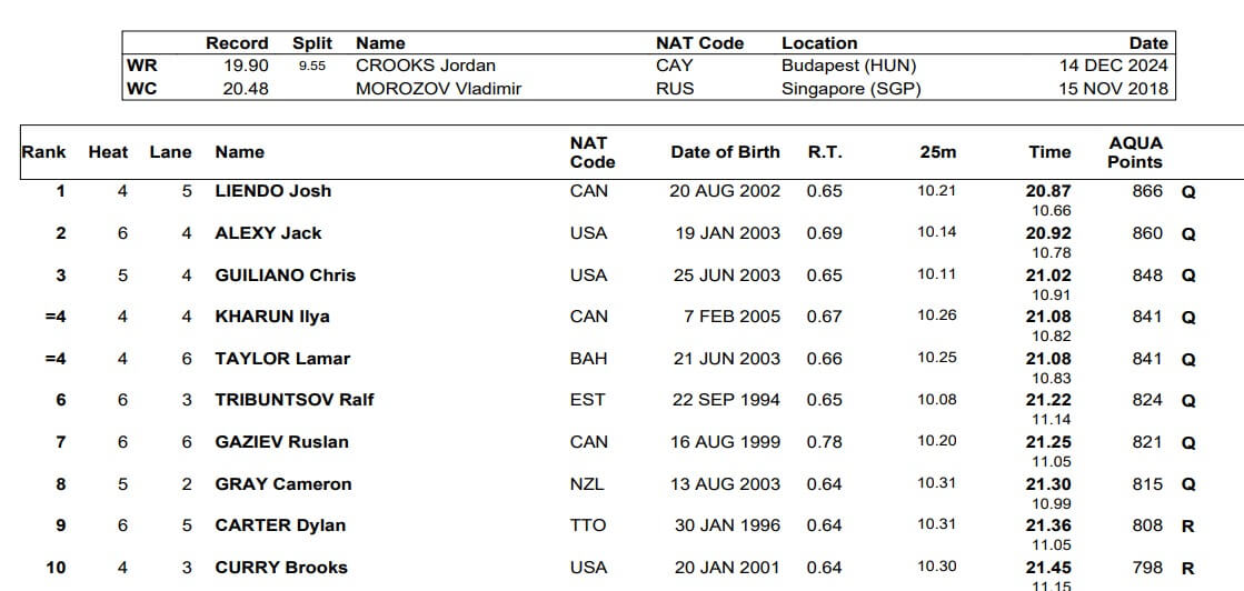 Estonia’s Ralf Tribuntsov took the sixth seed (21.22) ahead of Canada’s Ruslan Gaziev (21.25) and New Zealand’s Cameron Gray (21.30).