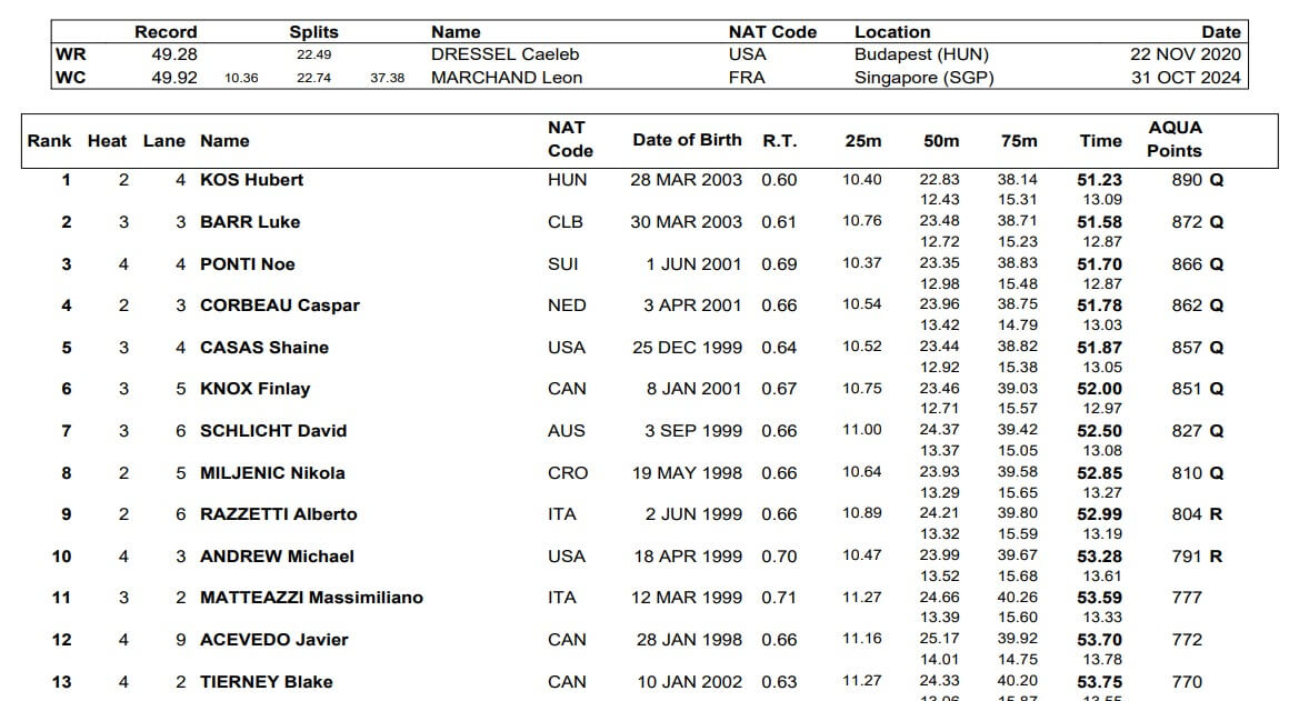 Kacper Stokowski took the second seed in 1:50.72, followed by Italian Olympic gold medalist Thomas Ceccon (1:51.2).