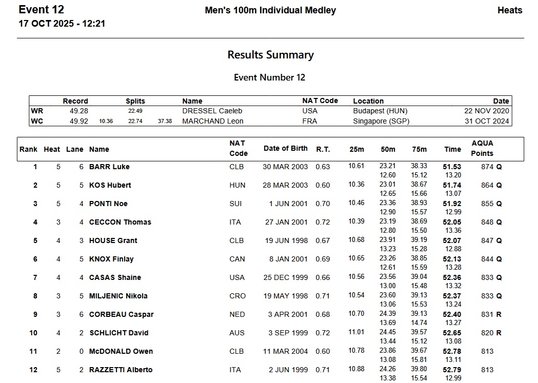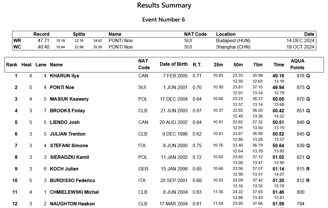 Second was Hubert Kos in 51.74, followed by Noe Ponti in 51.92. Ponti was second in Carmel, behind Shaine Casas, who qualified seventh in 52.36 on Friday.