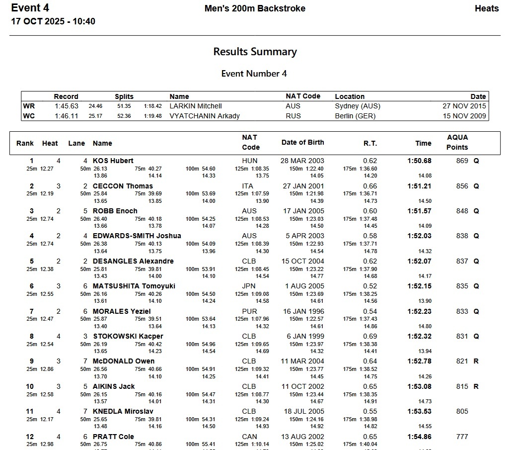 Carmel champ Hubert Kos is after the first two legs of the triple crown with a time of 1:50.68 to lead prelims. Second was Thomas Ceccon in 1:51.21, with Australian Enoch Robb third in 1:51.57.