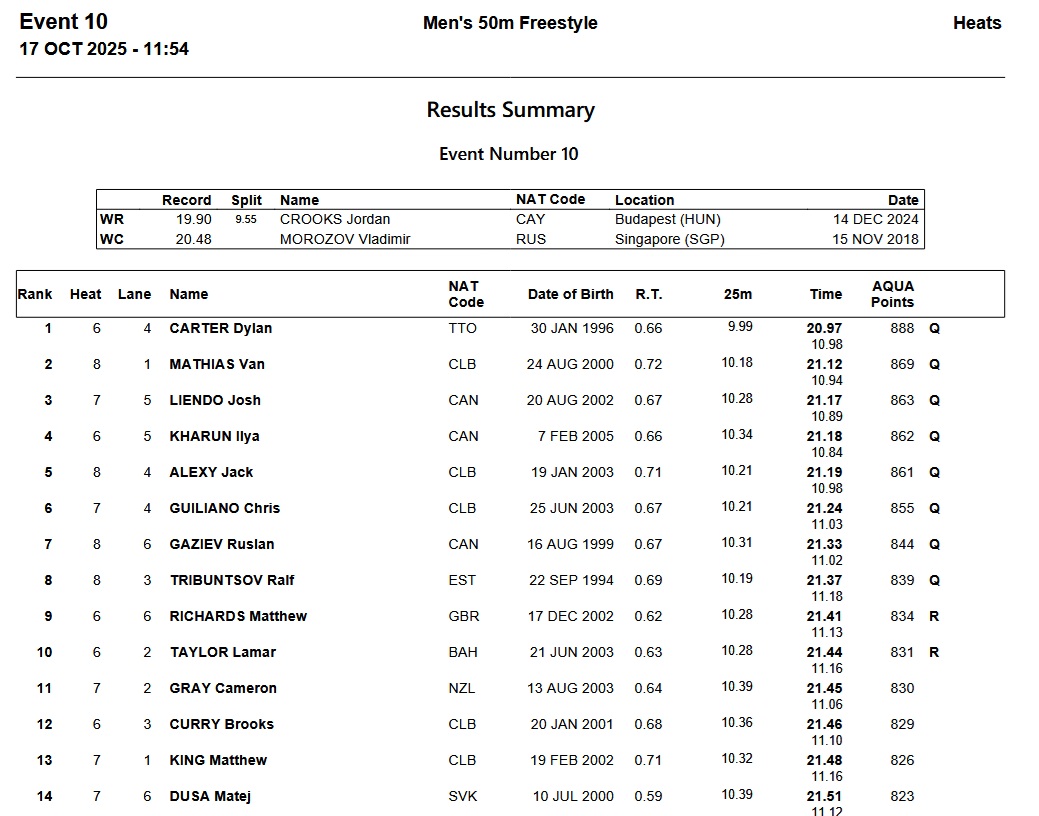 Three Canadians made the final, with Josh Liendo third in 21.17, followed .01 later by Ilya Kharun and with Ruslan Gaziev seventh. American Chris Guiliano, who won in Carmel, finished sixth in 21.24, with countrymen Van Mathias second and Jack Alexy fifth. The only interloper from abroad was Estonian Ralf Tribuntsov in eighth, edging Matt Richards by .04 seconds. Among those missing out was Italian Leonardo Deplano, a surprising 17th after finishing fifth in Carmel.