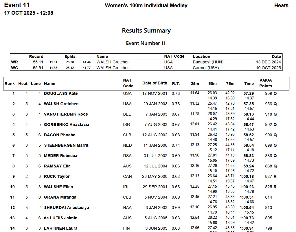Get ready for another battle of the UVA alums, with Kate Douglass leading Gretchen Walsh by .06 second sin prelims. Walsh got the better of her mate with a 55.91 in Carmel. Friday morning, it was Douglass to the wall first in 57.29, Walsh second in 57.35.
