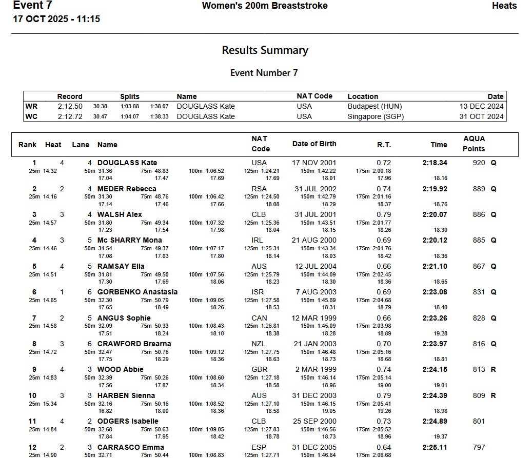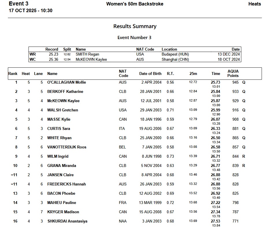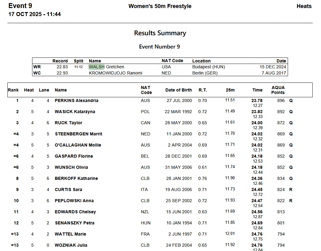 First the specialists. Alexandria Perkins of Australia led the way in 23.78, .04 seconds up on Kasia Wasick. That was the reverse order of finish in Carmel. Third was Taylor Ruck of Canada in 24.00.