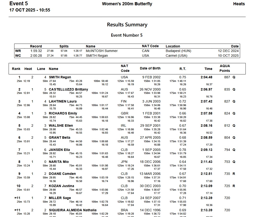 In an event with just 17 entrants after the scratch of Lana Pudar, Regan Smith eased to the top time of 2:04.48. After setting the meet record in Carmel, she’s eying a time under two minutes, with Summer McIntosh’s world record 1:59.32 in her sights.