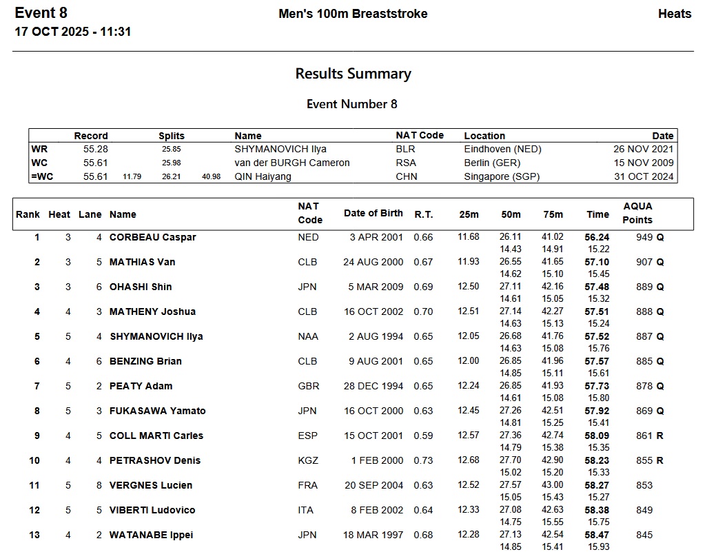 Leg 1 champ Caspar Corbeau proved he is ahead of the field, going 56.24 to set the pace. Second was American Van Mathias in 57.10. Shin Ohashi was third in 57.48, with Josh Matheny, Ilya Shymanovich, Brian Benzing and Adam Peaty following. There was no room in the A final for either Carles Coll Marti or Denis Petrashov.