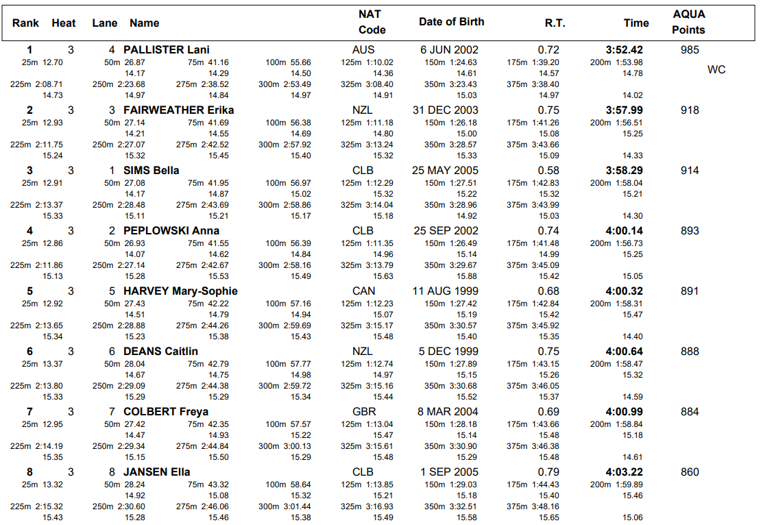 Placing second here was New Zealand’s Erika Fairweather, who pulled into second place with a time of 3:57.99. Fairweather was almost a second quicker than she swam last week in Carmel. Bella Sims was the top American and the final swimmer under 4:00 as she came in at 3:58.29 for third.