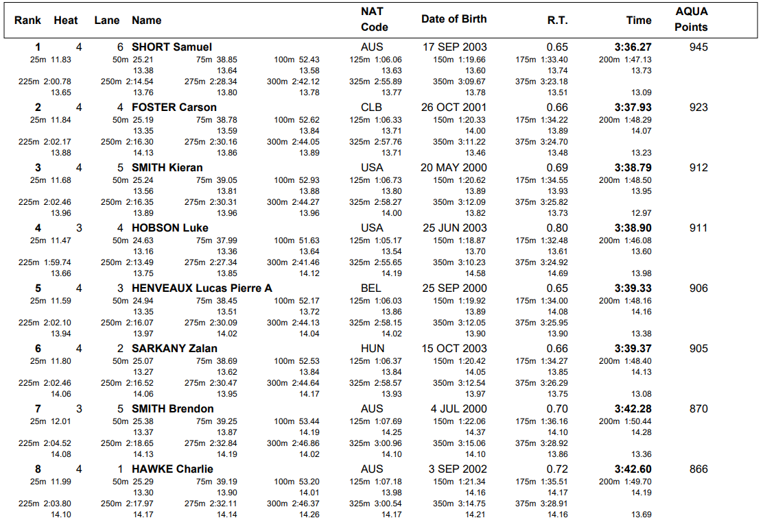 Different story in Westmont as Short blasted ahead of the field and did not let Foster close the gap down the stretch. Short clocked 3:36.27, more than one-and-a-half seconds clear of the field. Foster placed second in 3:37.93, just a tick behind his Carmel time, while American Kieran Smith placed third in 3:38.79. Luke Hobson, the short course world-record holder in the 200 free, put up a time of 3:38.90 in the early heats that ranked fourth overall.